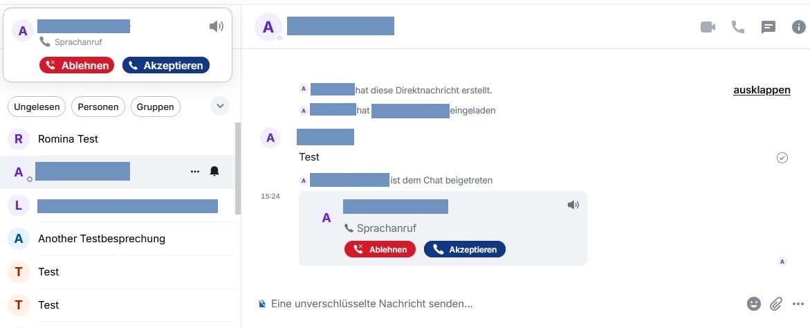 Sobald der Anruf angenommen wurde, öffnet sich dieser in einem neuen Fenster. Die Steuerung des Anrufs funktioniert genauso wie in regulären Videokonferenzen.