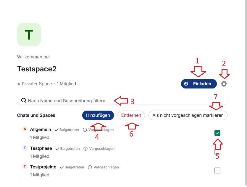 Sie können hinzugefügte Chats und/oder Spaces auch wieder entfernen. Markieren Sie dafür den gewünschten Chat oder Space (5) und klicken Sie dann auf die Schaltfläche Entfernen (6). Wenn Sie anderen Mitgliedern Ihres Spaces einen Chat/Space vorgeschlagen (oder nicht mehr vorschlagen) möchten, markieren Sie diesen zuerst (5) und klicken Sie dann auf Als (nicht) vorgeschlagen makieren (7).