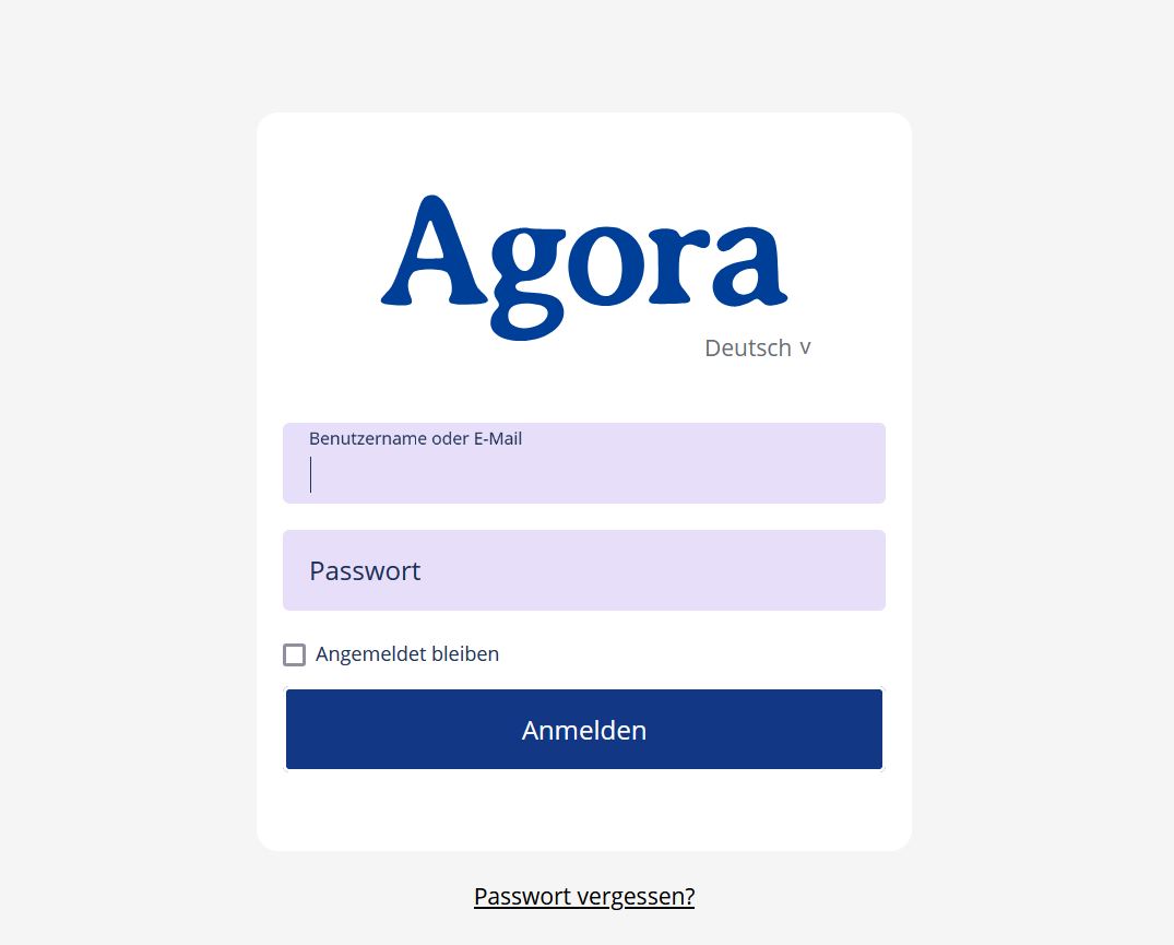 Um sich bei Agora anzumelden, gehen Sie zunächst auf die Webseite https://www.agora-oegd.de. Dort sehen Sie eine Anmeldeoberfläche. Geben Sie Ihren Benutzernamen und das Passwort ein.