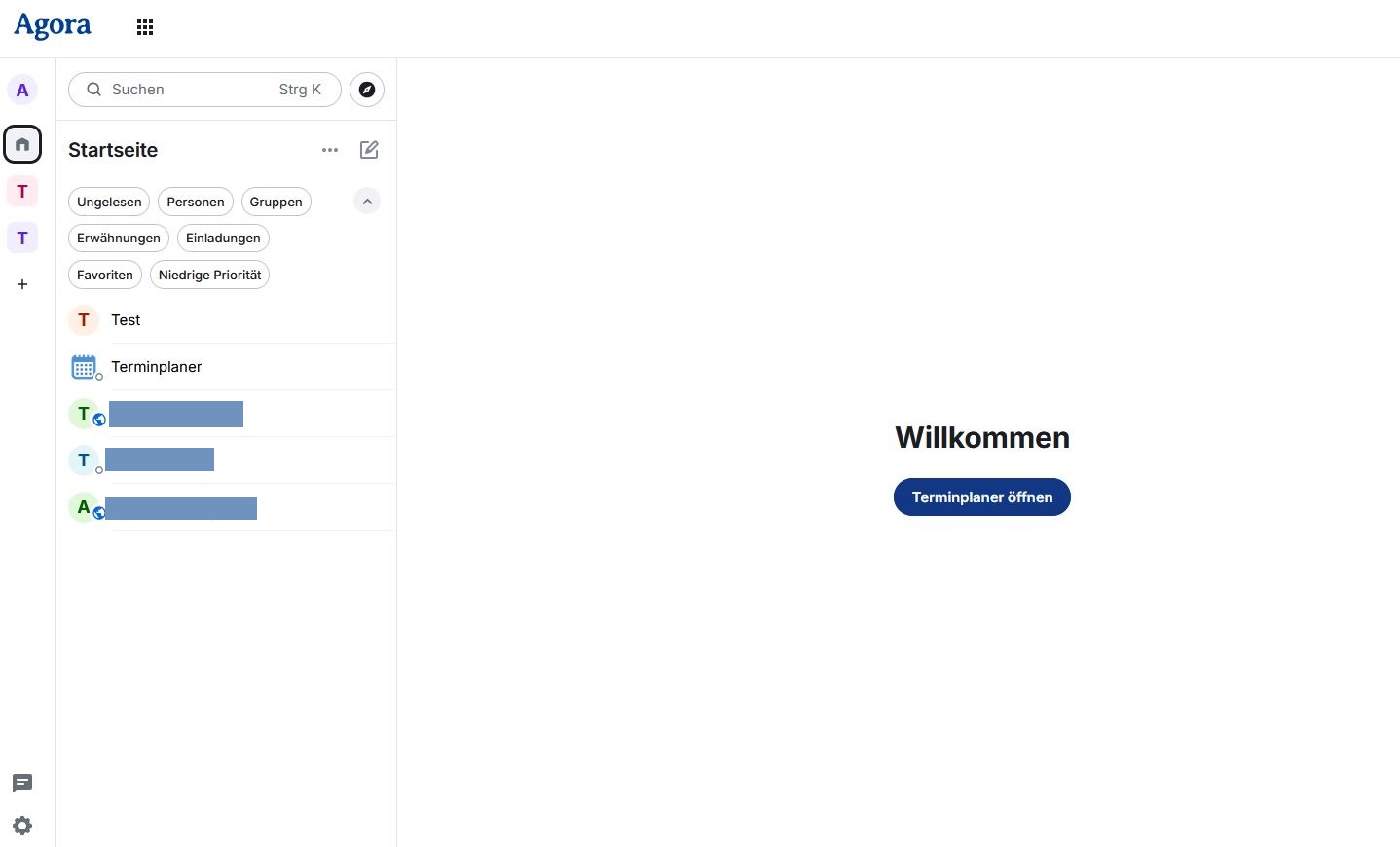 Auf der Startseite des Videokonferenzmoduls gibt es ganz links eine senkrechte Menüleiste und rechts daneben das Hauptmenü. Im Arbeitsbereich rechts sehen Sie zunächst eine Willkommensnachricht mit der Schaltfläche Terminplaner öffnen.
