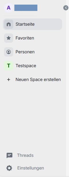 In der Menüleiste ganz links finden Sie ganz oben das Benutzermenü, dargestellt durch Ihr Namenskürzel oder Profilbild. Darunter befinden sich die Schaltflächen Startseite (Haussymbol), je nach Einstellung auch Favoriten (Sternsymbol) und Personen (Profilbildsymbol) sowie Neuen Space erstellen (Pluszeichen). Wenn Sie bereits Mitglied von Spaces sind, werden diese zwischen Startseite (oder Personen) und Neuen Space erstellen in Form von Kürzeln angezeigt.
