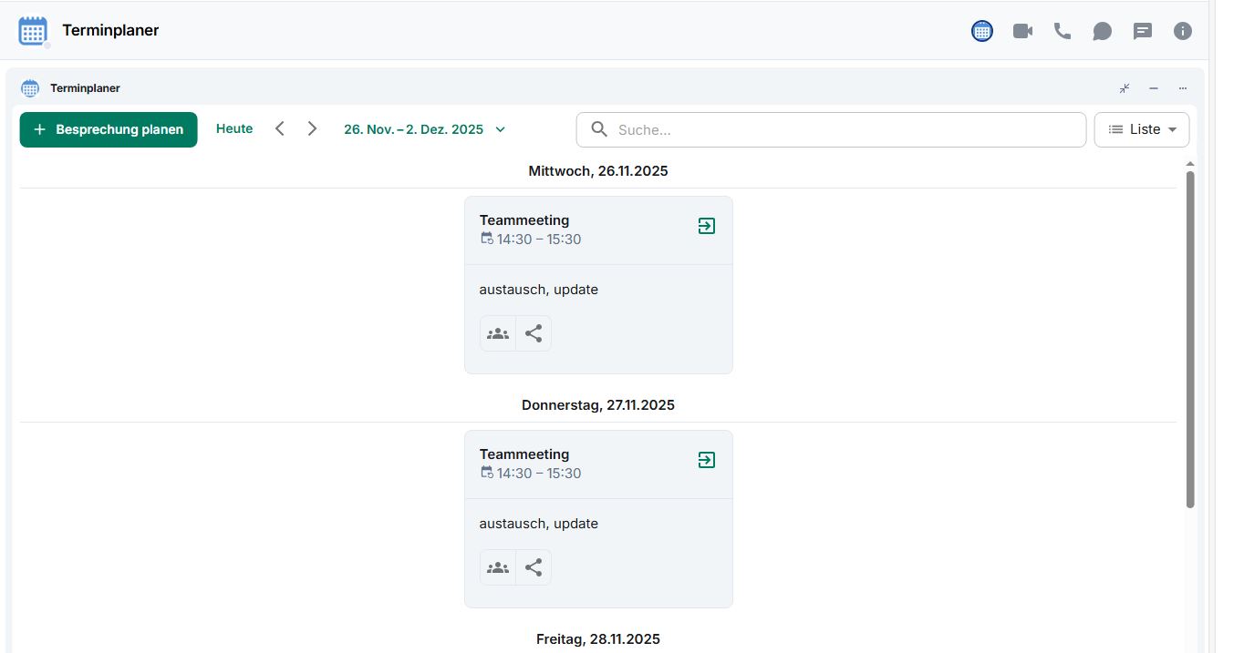 Im Terminplaner finden Sie alle geplanten Besprechungen und können auch neue Besprechungen planen. Sie können Ihre Termine für verschiedene Zeitintervalle oder auch als einfache Liste anzeigen lassen. Außerdem können Sie hier gezielt nach bestimmten Terminen suchen. Näheres zum Terminplaner erfahren Sie > hier.