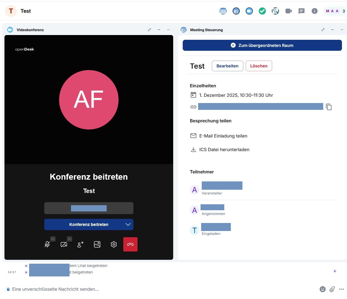 Ein Besprechungsraum bietet den gesamten Funktionsumfang des Videokonferenzmoduls. In einem Besprechungsraum können Chatnachrichten gesendet und Videokonferenzen durchgeführt werden. Darüber hinaus stehen verschiedene Widgets zur Verfügung, z. B. ein digitales Whiteboard, auf dem gemeinsam Inhalte bearbeitet und als Präsentation dargestellt werden können.