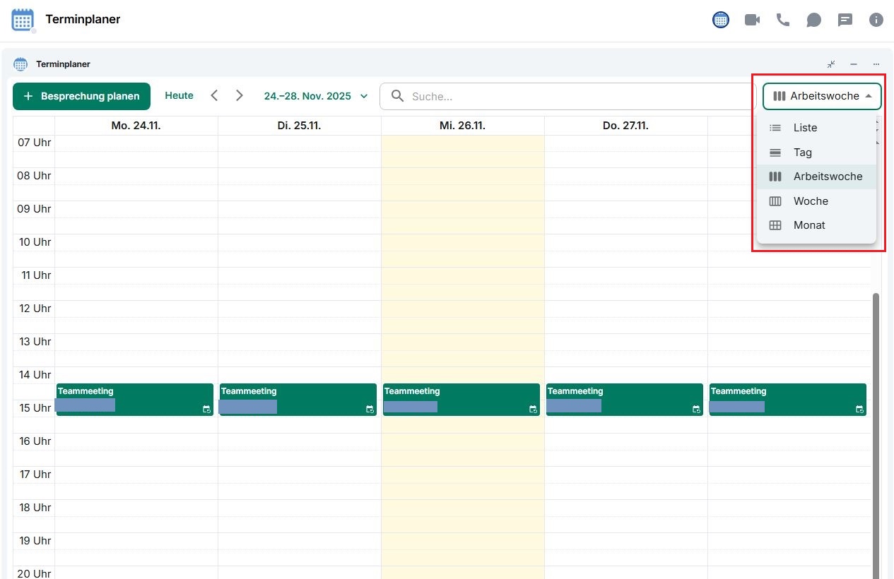 Der Terminplaner bietet einen Überblick über bevorstehende Besprechungen und ermöglicht die Organisation von Terminen. Dabei stehen unterschiedliche Ansichtsmodi zur Verfügung, die über das Dropdown-Menü oben rechts ausgewählt werden können: Liste, Tag, Arbeitswoche, Woche und Monat. Im Modus Liste werden alle bevorstehenden Termine chronologisch aufgelistet. Die anderen Modi zeigen jeweils nur die Termine des gewählten Zeitraums an.