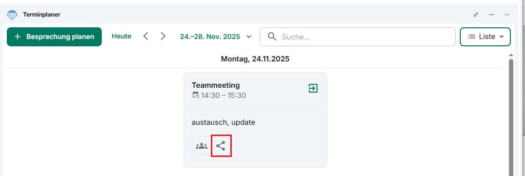 Darüber hinaus bietet der Terminplaner verschiedene Möglichkeiten, die Termine für Besprechungen mit anderen Nutzenden zu teilen. Um einen Besprechungstermin zu teilen, suchen Sie z.B. den gewünschten Termin im Terminplaner (Listenansicht) und klicken Sie auf die Schaltfläche Besprechung teilen (Teilensymbol).