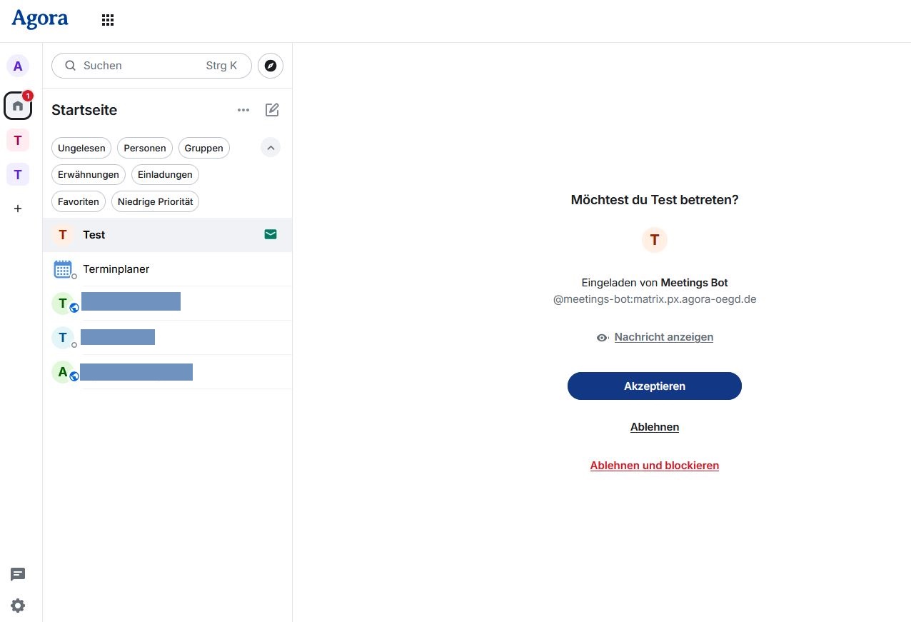 Wenn Sie die Einladung zu einer Besprechung öffnen, können Sie entscheiden, ob Sie die Einladung annehmen oder ablehnen möchten. Nutzen Sie die Funktion Ablehnen und blockieren, wenn Sie keine weiteren Einladungen von der Person erhalten möchten, die Sie zu dieser Veranstaltung eingeladen hat. Wenn Sie eine neue Besprechung erstellt haben müssen Sie dieser ebenfalls zunächst beitreten (Sie erhalten eine Einladung vom Meetings-Bot).