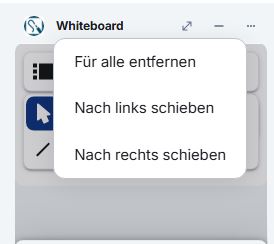 - Optionen (Drei-Punkte-Menü): Wenn Sie auf Für alle entfernen klicken, wird das aktuell geöffnete Widget dauerhaft aus der Besprechung entfernt. Außerdem können Sie das Widgetfenster nach links/rechts verschieben. Diese Funktionen steht nur Moderatorinnen und Moderatoren zur Verfügung. Wenn Sie an einer Besprechung teilnehmen, die Sie nicht selbst geplant haben, wird Ihnen das Drei-Punkte-Menü nicht angezeigt.