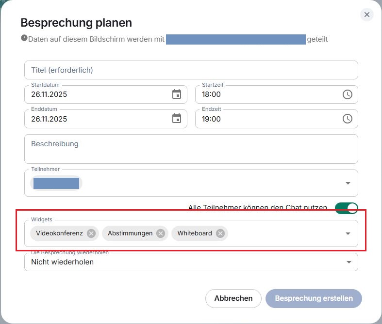 Aktuell ist es nicht möglich, Widgets während einer laufenden Besprechung hinzuzufügen oder zu entfernen. Entscheiden Sie daher schon beim Planen der Besprechung, welche Widgets Sie verwenden möchten. Hierzu steht Ihnen im Fenster “Besprechung planen” der Abschnitt “Widgets” zur Verfügung. Wenn Sie sich nicht sicher sind, lassen Sie einfach alle verfügbaren Widgets aktiviert (Standardeinstellung).
